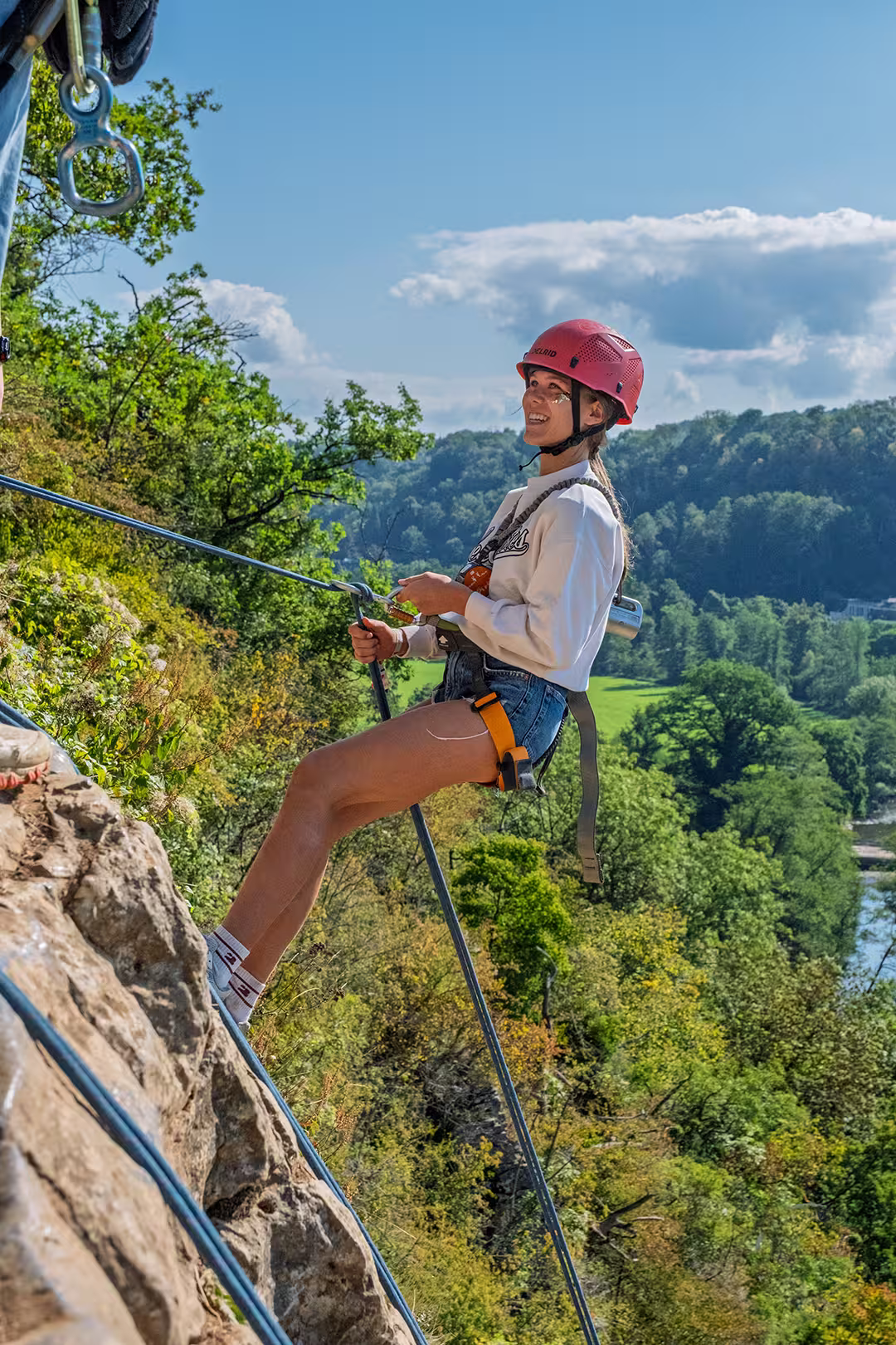 Overdag sporten en spelen we op ons uitgestrekte natuurdomein, gaan we kajakken op de Ourthe, of trekken we op ontdekking in de omgeving van het kleinste stadje ter wereld.